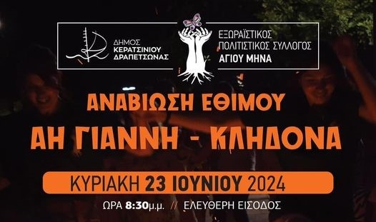 ΑΝΑΒΙΩΣΗ ΕΘΙΜΟΥ ΑΗ ΓΙΑΝΝΗ ΚΛΗΔΟΝΑ ΑΠΟ ΤΟΝ ΕΞΩΡΑΪΣΤΙΚΟ ΠΟΛΙΤΙΣΤΙΚΟ ΣΥΛΛΟΓΟ ΑΓΙΟΥ ΜΗΝΑ ΚΕΡΑΤΣΙΝΙΟΥ