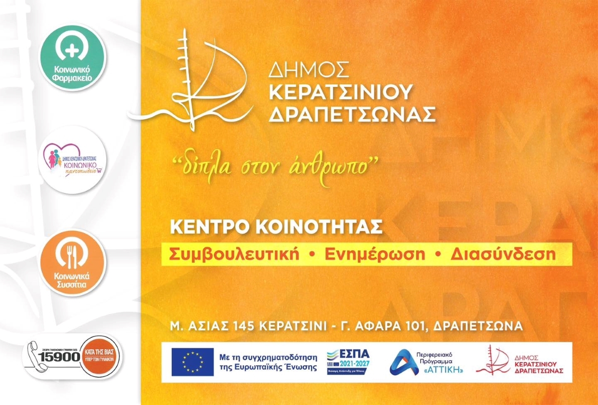 Το Διευρυμένο Κέντρο Κοινότητας Δήμου Κερατσινίου - Δραπετσώνας είναι μια καινοτόμα δομή που αποτελεί το πρώτο σημείο επαφής του πολίτη με την κοινωνική υπηρεσία του Δήμου.