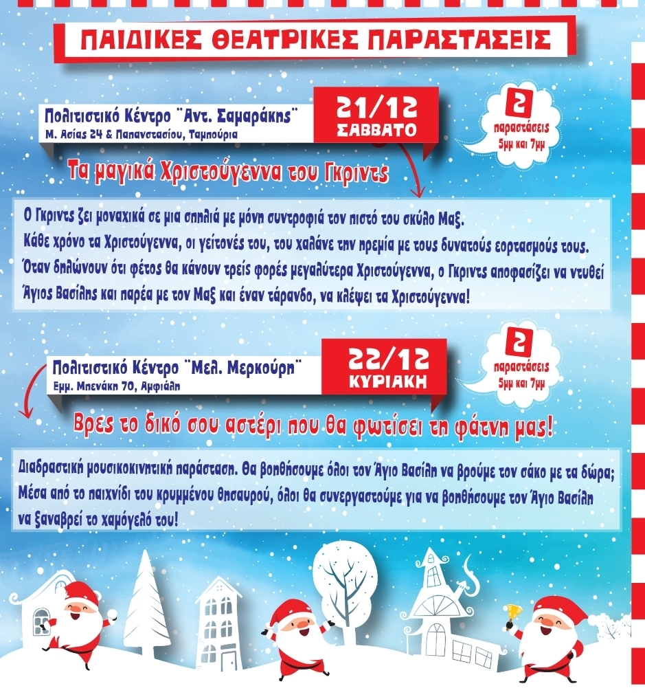 Στο πλαίσιο των χριστουγεννιάτικων εκδηλώσεων του Δήμου μας, μπορείτε να παρακολουθήσετε αυτό το Σαββατοκύριακο τις παρακάτω παιδικές θεατρικές παραστάσεις με δωρεάν όπως πάντα είσοδο.