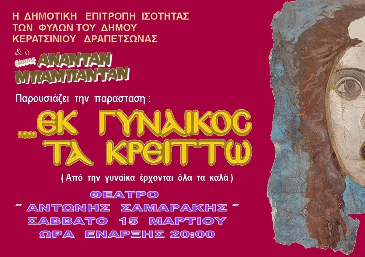 Η Δημοτική Επιτροπή Ισότητας των Φύλων του Δήμου Κερατσινίου - Δραπετσώνας στο πλαίσιο της Παγκόσμιας ημέρας Γυναίκας διοργανώνει, σε συνεργασία με τον θίασο «Αναντάν Μπαμπαντάν» εκδήλωση, παρουσιάζοντας τη θεατρική παράσταση «...ΕΚ ΓΥΝΑΙΚΟΣ ΤΑ ΚΡΕΙΤΤΩ» (Από την γυναίκα έρχονται όλα τα καλά)