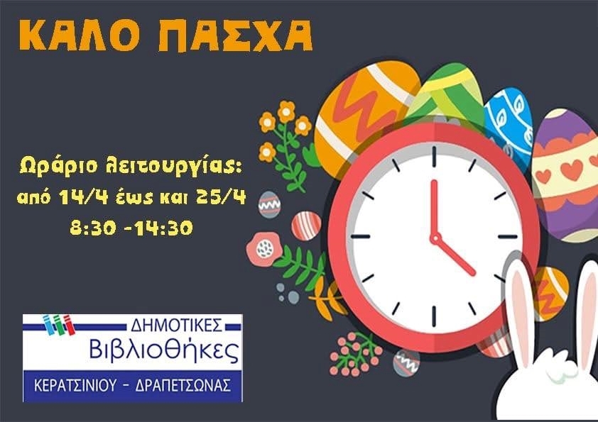 11 ΔΗΜΟΤΙΚΕΣ ΒΙΒΛΙΟΘΗΚΕΣ - ΠΑΣΧΑΛΙΝΟ ΩΡΑΡΙΟ Συντάχθηκε στις 11 Απριλίου 2025. Καταχωρήθηκε στο Ανακοινώσεις. Ο Δημοτικές Βιβλιοθήκες Κερατσινίου-Δραπετσώνας από τη Δευτέρα 14/4/2025 έως και την Παρασκευή 25/4/2025 θα λειτουργούν: 8:30- 14:30. Εκτύπωση Email