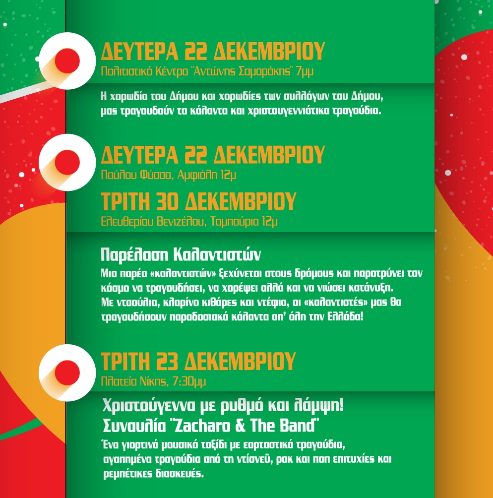 Η χορωδία του Δήμου μας και χορωδίες των συλλόγων του Δήμου, μας τραγουδούν τα κάλαντα και χριστουγεννιάτικα τραγούδια.
