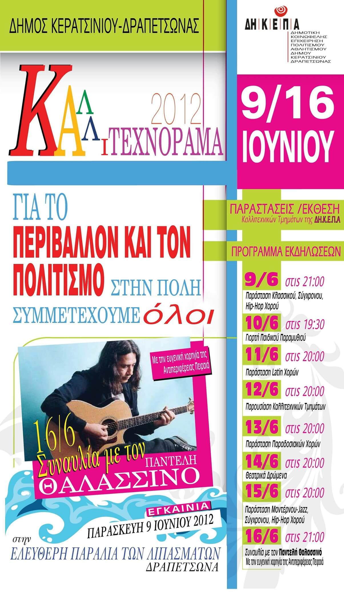Όλες οι εκδηλώσεις Στο περιβάλλον και στον πολιτισμό είναι αφιερωμένο το ΚΑΛΛΙΤΕΧΝΟΡΑΜΑ 2012 που διοργανώνει η Δημοτική Κοινωφελής Επιχείρηση του Δήμου Κερατσινίου Δραπετσώνας.